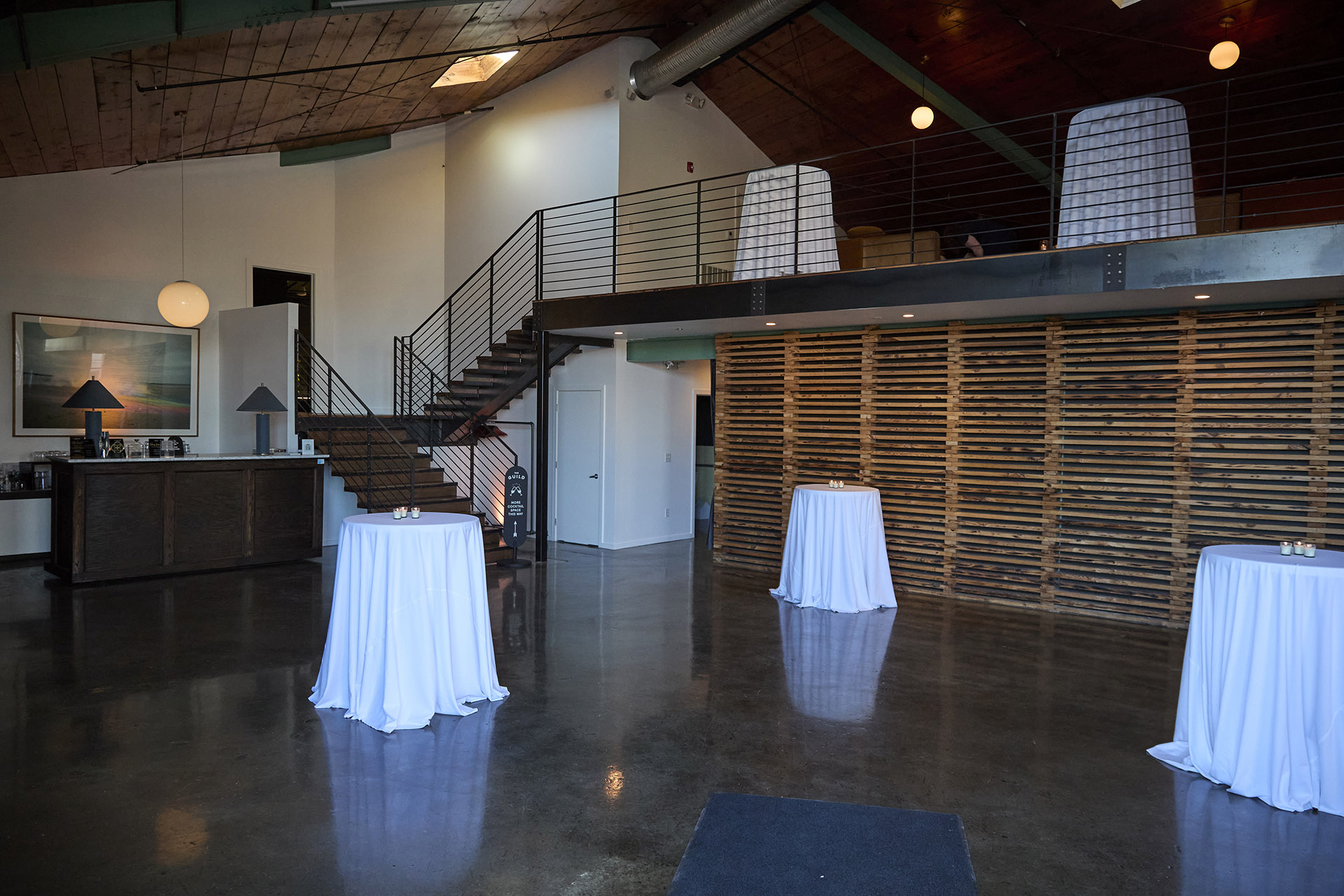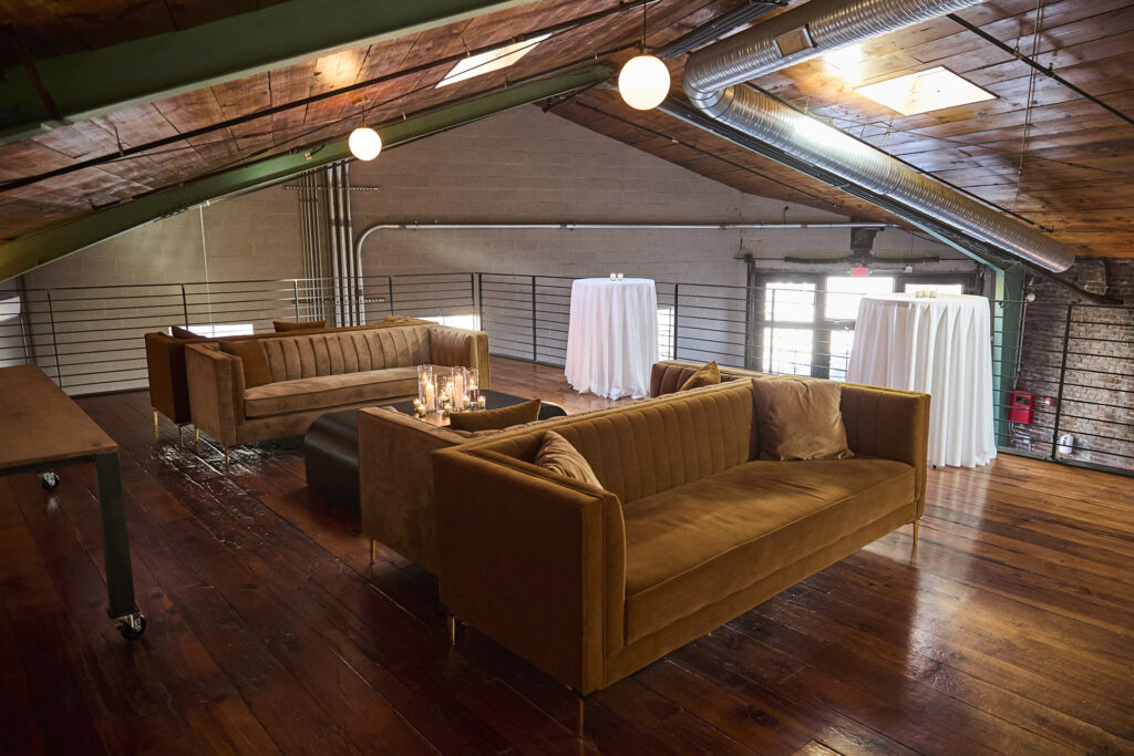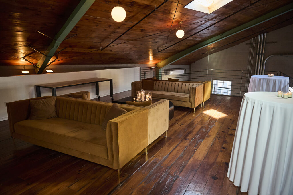 Ascend to The Loft, a beautifully styled retreat that offers an elevated and more intimate perspective. This versatile space can serve as a VIP lounge, a private suite for weddings, or a quiet area for conversation away from the main event. In addition, the space features two private suites, an ADA accessible bathroom, and an additional relief bar to ensure seamless service for larger crowds.